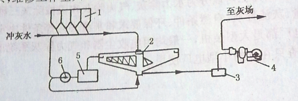 1. 濕式除灰器斗;2.濃縮池;3.吸漿池;4、油隔離泥漿泵;5. 回水池;6.會水泵
