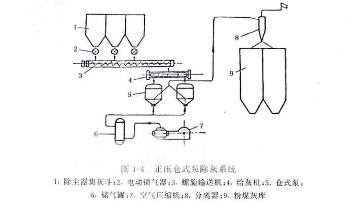 圖1—4是常用的正壓倉式泵除灰系統,在此系統中,從干式除塵器分離下的灰,經電動鎖氣器、螺旋輸送機和給灰機進入倉式泵、用壓縮空氣將灰吹送。