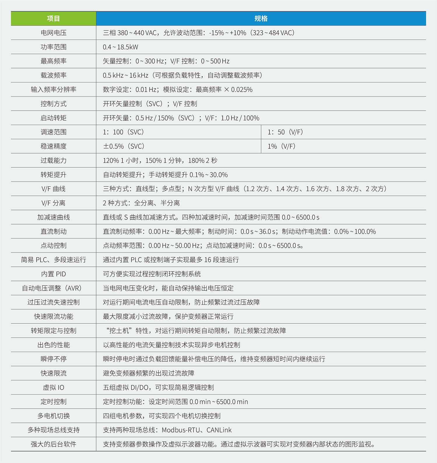 MD310 系列變頻器是一款通用緊縮型多功能變頻器,采用開環矢量和V/F 控制方式,以高性能的電流矢量控制技術可實現異步電機控制。MD310 標配RS485 通訊接口,支持Modbus RTU 通訊,可擴展I/O 擴展卡、CAN 通信擴展卡。內置PID 可方便實現閉環過程控制系統,最多可實現16 段速運行。